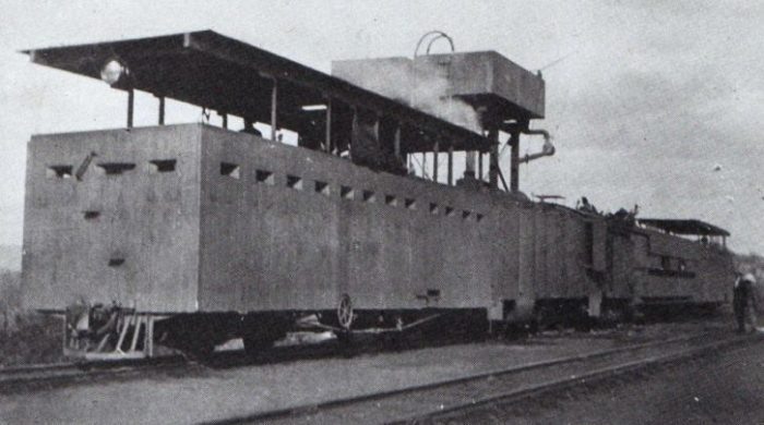 H.M. armoured train, ‘Simba’ was built in the workshops at Nairobi to counteract the German mounted patrols that carried out nuisance raids on the railway during the War. [3][4] It was destroyed by a mine.