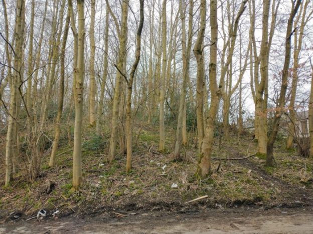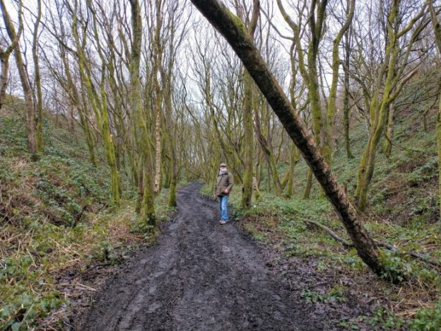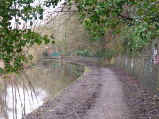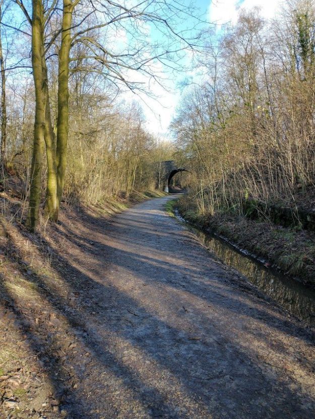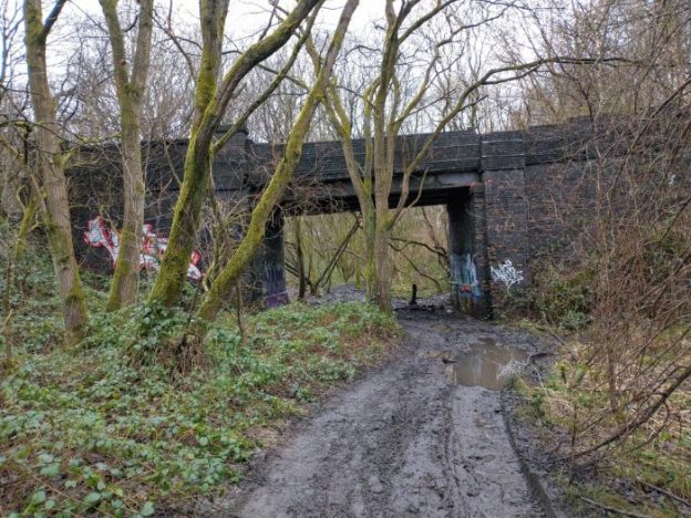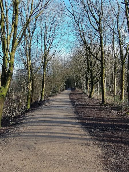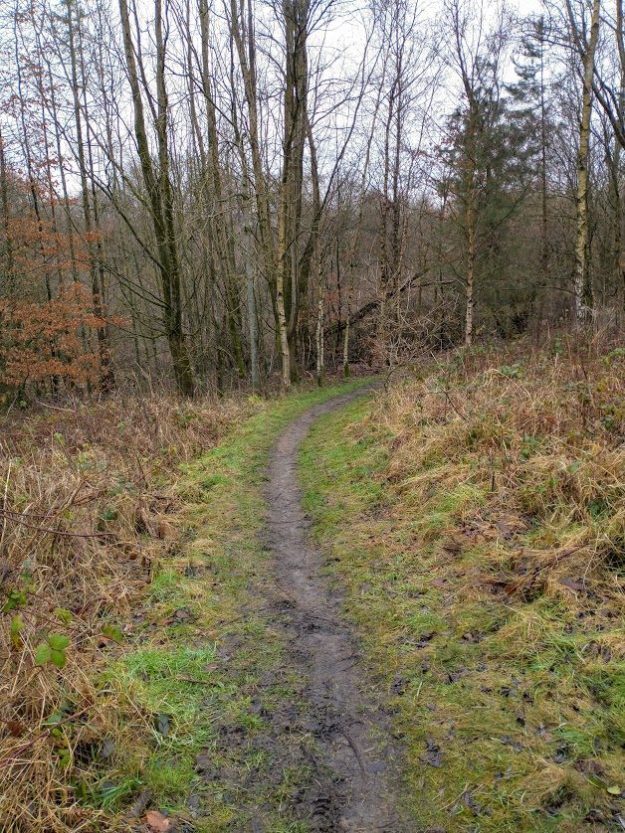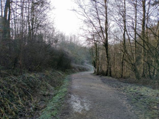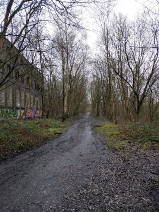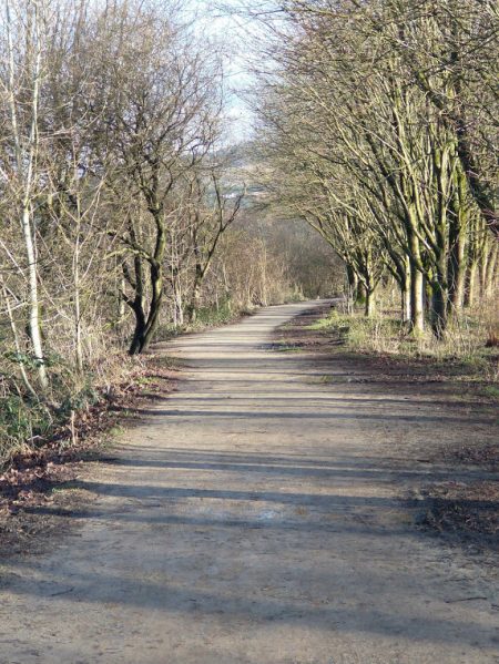Looking towards the location of the Royal George Tunnel Portal from a point alongside the location of the old Gas Works. The path climbs from the cutting floor at track-bed level up to meet Huddersfield Road ahead. (Photograph by Joanna Farnworth on 15th January 2021.)