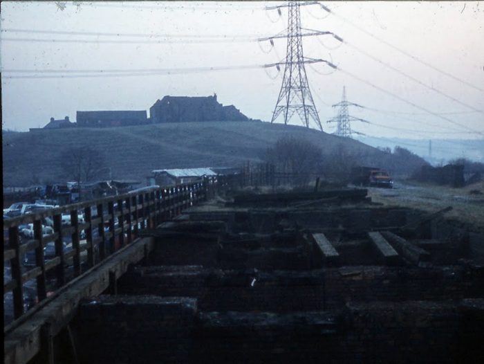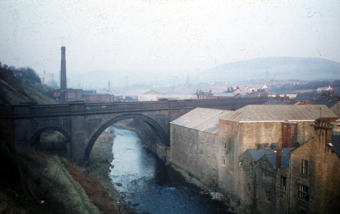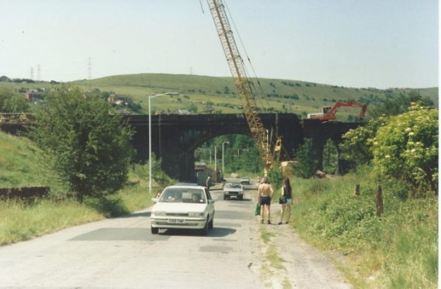 Dacres (or Friezland) viaduct on the Micklehurst Loop line, demolished at the end of 1970. The footbridge in the distance is at Friezland station. Although the station closed in 1917 the building (obscured by the telegraph pole) still stands in 2020, (c) Manchester Libraries.[35]