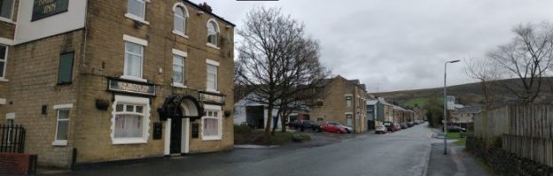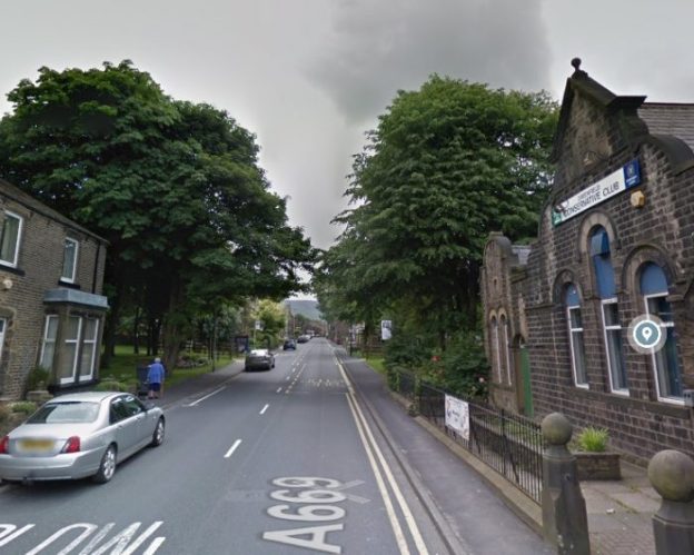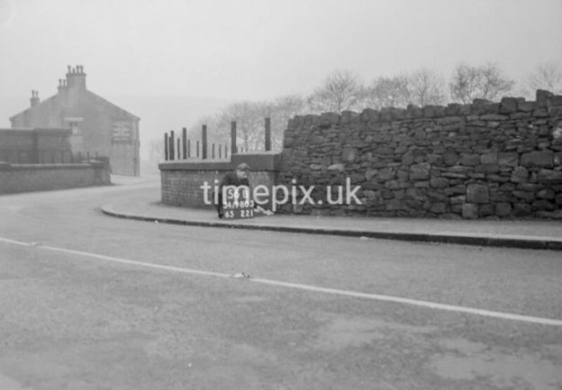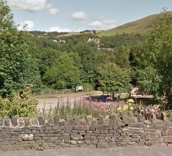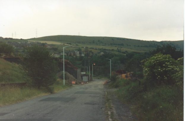 The footpath following the old line crossed Greenbridge Lane at road level and then continued along the path visible ahead which probably is below what was the platforms of Friezland Station. (Google Streetview.)
