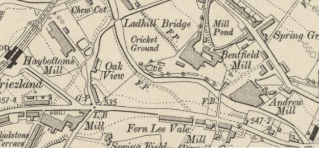 Bentfield Mill – was at different times a cotton mill and a woolen mill. Notes: Built originally at as a woolen mill in around 1790, it was rebuilt as a Cotton Mill by Robinson Brothers in 1868. It reverted to wool in 1892. Chew Brook Drive and its housing is built on the site.