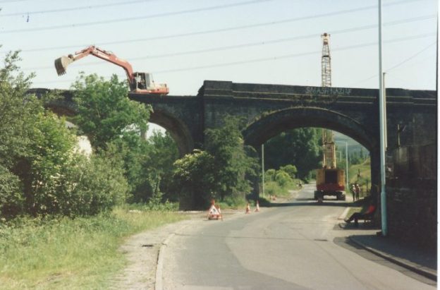 The line then began another gentle curve towards the Northeast. and passed under a series of three structures. First an arch bridge of similar construction to the first bridge out of Micklehurst Station. Then a footbridge spanning the two track mainline and then a longer footbridge which spanned the running lines and the Gas Works sidings.