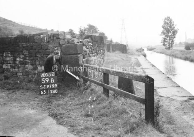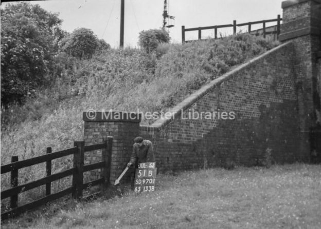 Man marking Ordnance Survey minor control revision point on the parapet corner of the first bridge North of Micklehurst Station – Winterford Road Bridge. Winterford Lane Bridge can be seen beyond, (c) Manchester Libraries. [24]