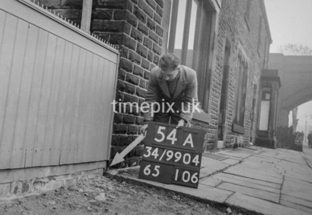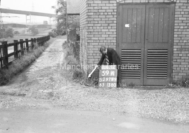 Man marking Ordnance Survey minor control revision point a little further to the East on the A635, (c) Manchester Libraries. [28]
