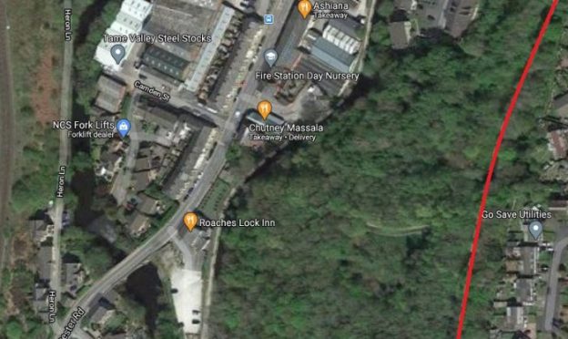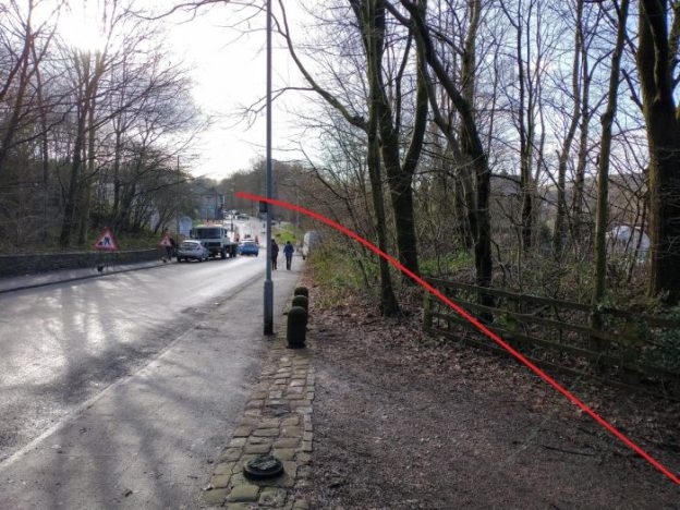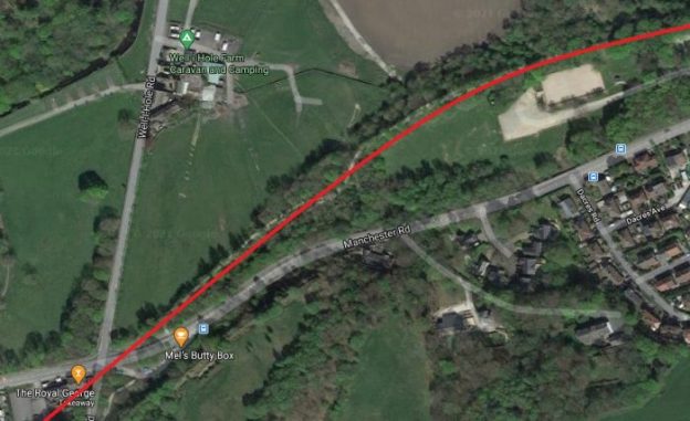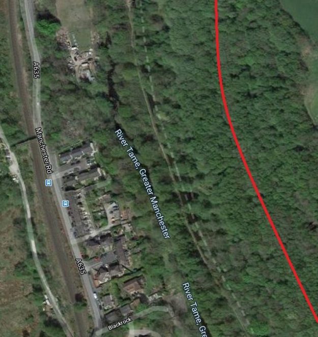 Chew Valley Road at the point where the Micklehurst Loop crossed the road by means of an arched bridge. The trees sit where the bridge abutments once sat! (Google Streetview.)