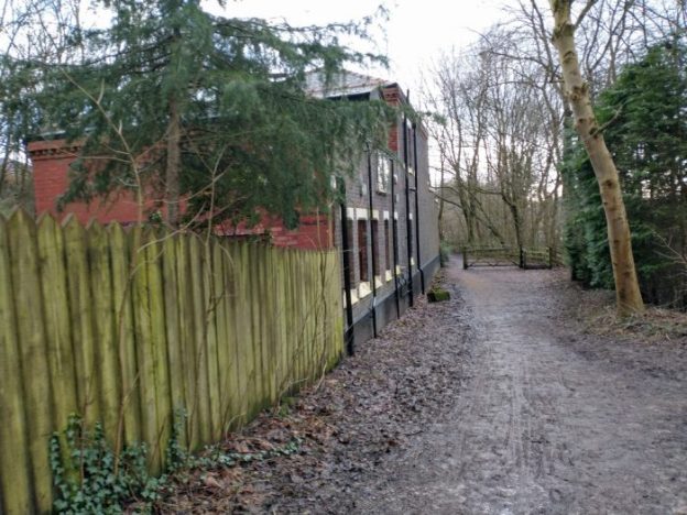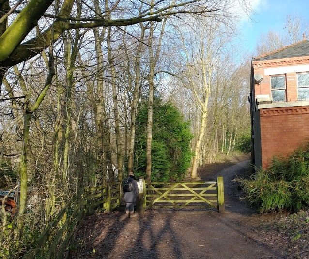 Protected by a five-bar gate immediately adjacent to the Station building, the linear walkway following the line recommences. We had to leave it further South as the Micklehurst Goods Yard is in private hands.