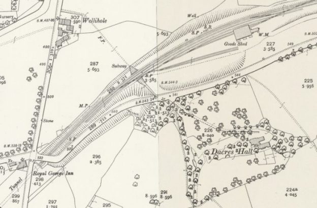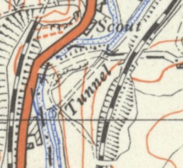 A further extract from the OS 1:10,560 series maps of the 1950s. The Royal George Pub and Tunnel are in the bottom left of the extract. The Goods Shed which features towards the top right was Friezland Goods Shed. [17]