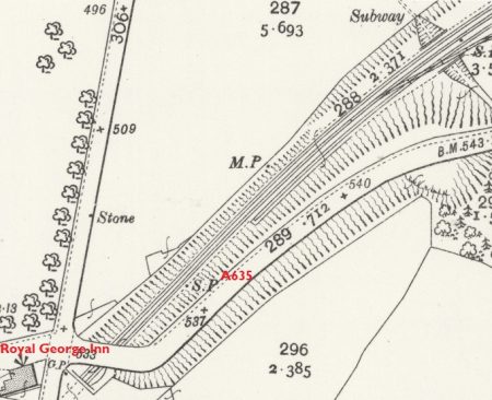 The Royal George Tunnel was named for the pub which stood over it at the junction between Manchester Road (A635) and Huddersfield Road/Well-i-Hole Road (B6175). The tunnel was 140 yards (128 metres) long. Immediately at its Northeastern end, the A635 was carried over the Line on a simply supported span.