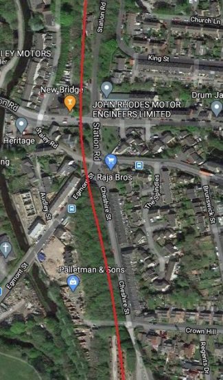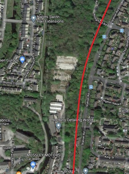 A 21st century view South the location of Micklehurst Passenger Station, taking in the location of the Micklehurst Viaduct. The old line is shown approximately by the red line. We are standing next to the pavement on Station Road and Cheshire Street can be seen in the far distance. (My photograph, 22nd January 2021.)