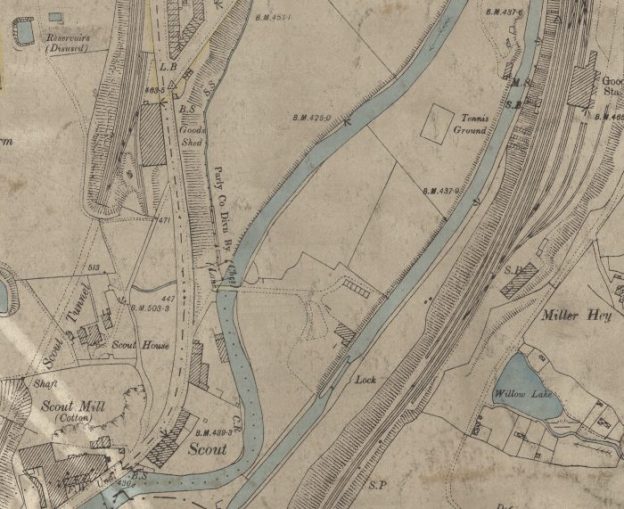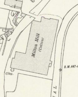 Milton Mill – was actually built in 1892 but did not feature on the 1898 OS 25″ Map but was included on the following series as the small extract above shows. The Architects were A H Stott & Sons and the mill was built for the Milton Spinning Co. Ltd. [11][5: p118]