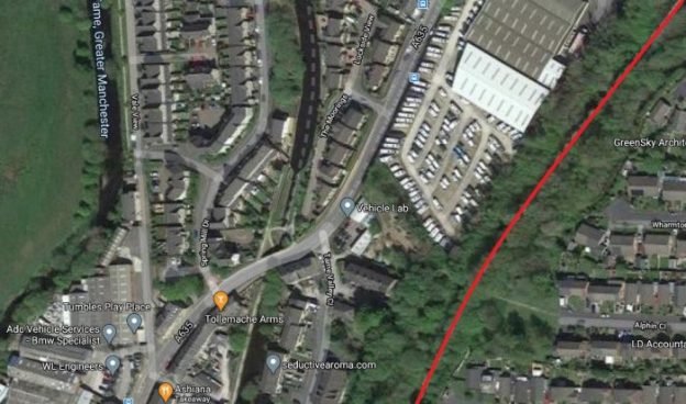 The same area as in the 25″ OS Map extract above. Stamford Mill has been replaced by Roughtown Court. The track-be of the Loop is marked with the read line. (Google Maps.)