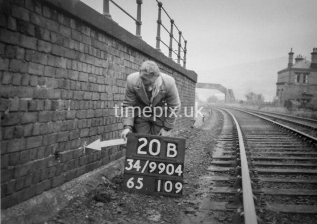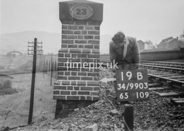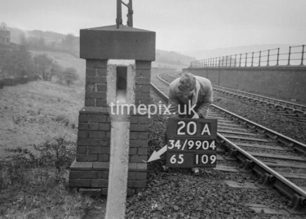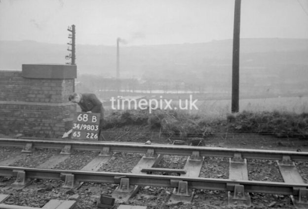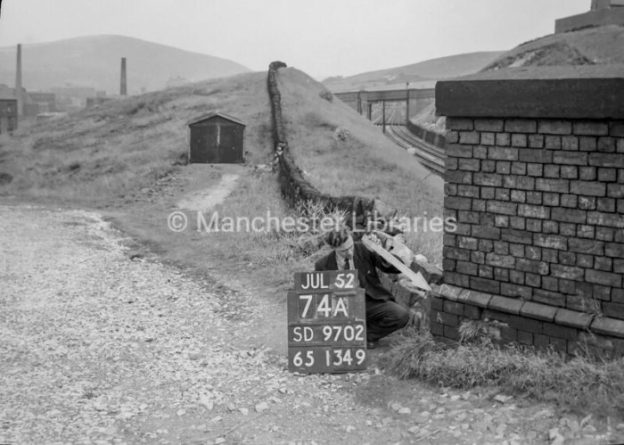 Man marking Ordnance Survey minor control revision point with an arrow on Friezland Viaduct. This picture is taken close to the Northeast pilaster at the end of the viaduct parapet and shows the location of Friezland Station in the 1950s. The station house still stands, as does the footbridge but it appears that the platforms have been removed, (c) Manchester Libraries. [37]