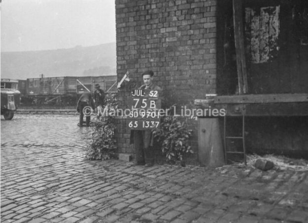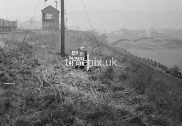 Man marking Ordnance Survey minor control revision point close to Friezland Goods Shed. The picture is taken looking to the West from a point directly opposite the Goods Shed along the North side of the MIcklehurst Loop. The signal box is visible in the middle-distance, (c) Manchester Libraries. [30]