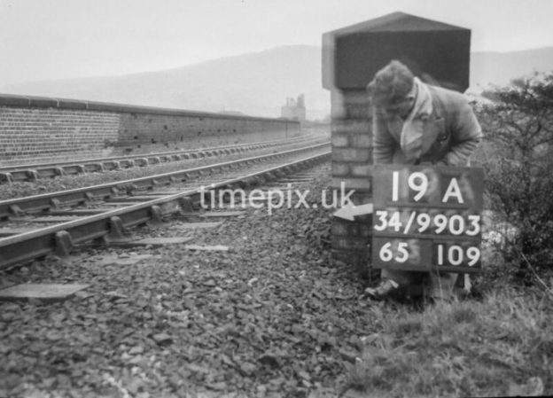 Man marking Ordnance Survey minor control revision point with an arrow on the Southeast pilaster of Friezland Viaduct. The photograph is taken looking along the Loop Line to the West, (c) Manchester Libraries. [38]