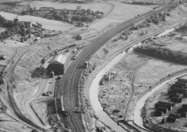 An extract from photograph EAW035919 from Britain From Above website. This view looks from the Northwest across the top of Mossley Gas Works and the Gas Works sidings towards the Micklehurst Loop Line. The three bridges referred to above are evident over the line as it enters the picture in the top-right coming from Micklehurst. Note the small engine shed towards the top-right of the image, (c) Britain From Above. [13]
