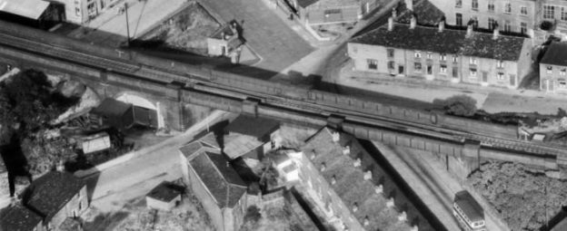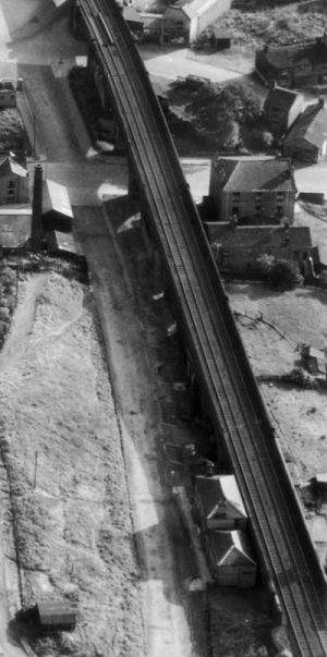 The passenger station building is also in private hands. The platforms were not adjacent to the station building as the railway was still on viaduct as it passed the back of the station house. A covered ramp led up towards wooden platforms a little distance to the North of the Station building. They were located in the position pointed to by the top of the chimney in the adjacent aerial image. Over a few tens of yards, the modern path rises from the road level to track-bed level and then levels out to follow the track-bed.