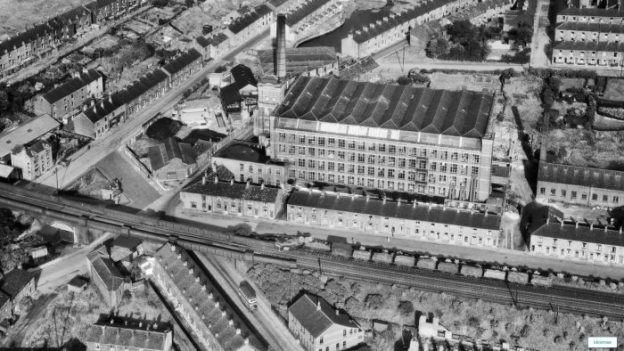 The layout of the mills as seen in 1947 from the air to the South. Winterford Road Bridge is on the right of the image. [2]