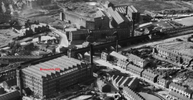 Friezland Station sat between two viaducts. In this view from across the Tame Valley the erstwhile Friezland Viaduct can be seen on the right. The Greenfield Viaduct creeps onto the left of the picture. The wooden platforms and shelters of the Station are at the centre of the image. This image is included here courtesy of Alan Young. He comments: “Looking south-east towards Friezland station from a point close to Greenfield station c1910. Friezland station is seen between Friezland Viaduct (right) and Greenfield Viaduct (left), with the rear of the down platform shown clearly. The waiting room block and down platform are both constructed of timber. The footbridge connecting the platforms is visible in front of the station building, which adjoins the up platform. It is assumed that this platform was also of timber construction, like all others on the Micklehurst Loop. Left of the station, the large building with the chimneystack is Haybottom’s bleaching mill. The desolate heights of Saddleworth Moor provide a dramatic backdrop.” The photograph comes from the Peter Fox ‘Old Saddleworth’ collection. [34]