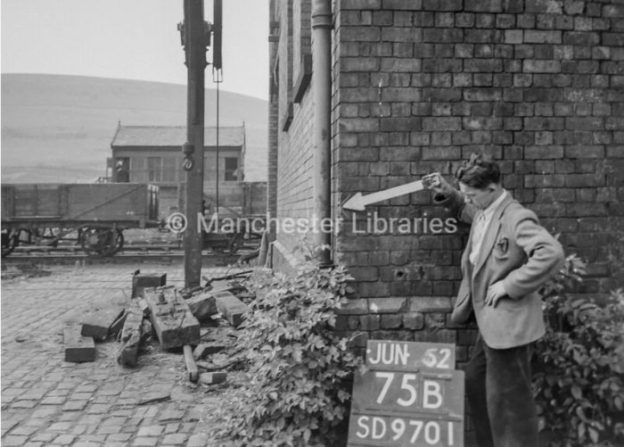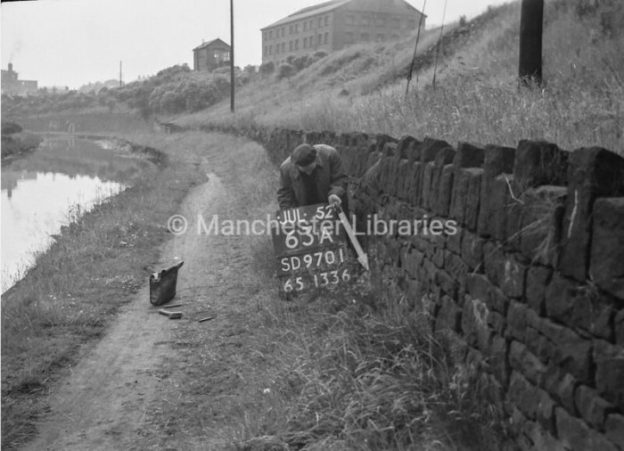 Man marking Ordnance Survey minor control revision point with an arrow on Manchester Road (A635) in Friezland. In the background, Friezland Goods Shed appears out of the mist, (c) Manchester Libraries. [27]