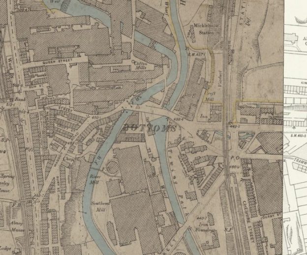 An extract from the 25″ OS Map series from the 1920s. which shows Roughtown which sat on the valley side above the river to the West and Woodend in the Valley floor. Both the original mainline and the Micklehurst Loop can be seen. Stamford Mill sits at the centre of the extract. [1]