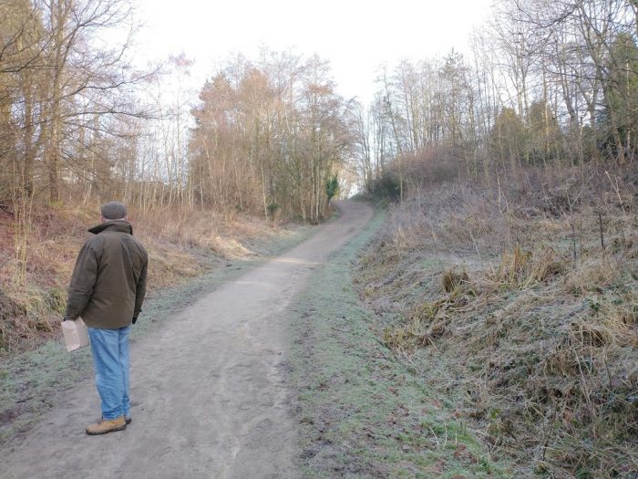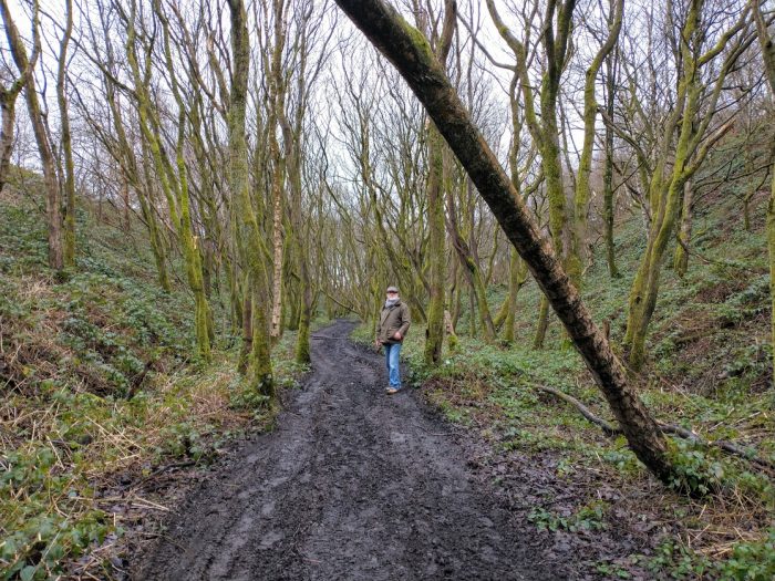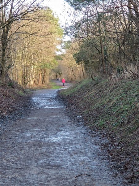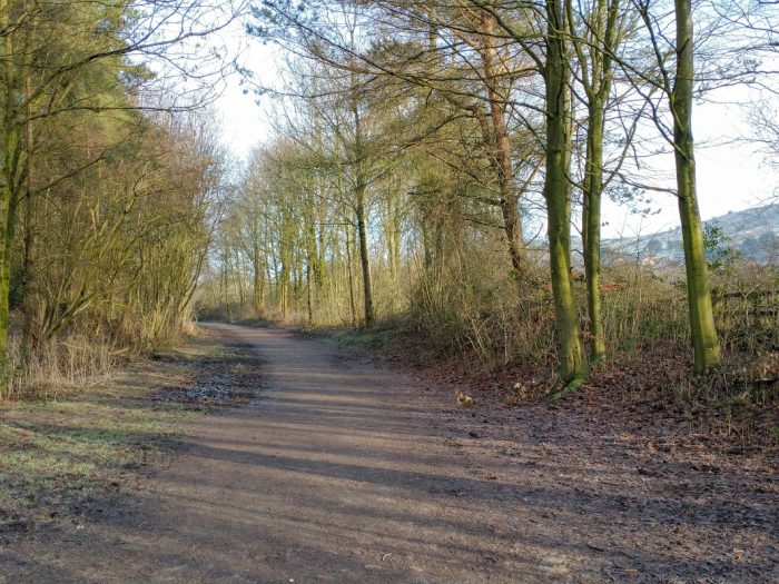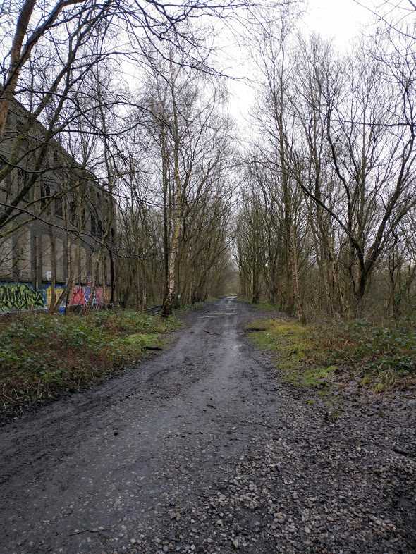 Looking towards the location of the Royal George Tunnel Portal from a point alongside the location of the old Gas Works. The path climbs from the cutting floor at track-bed level up to meet Huddersfield Road ahead. (Photograph by Joanna Farnworth on 15th January 2021.)