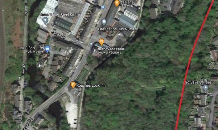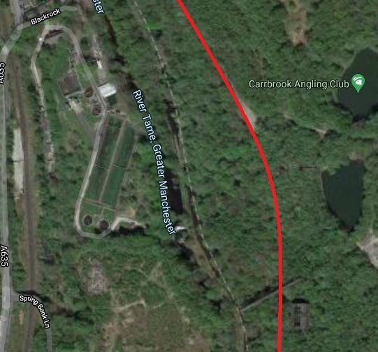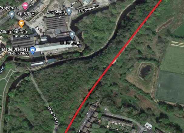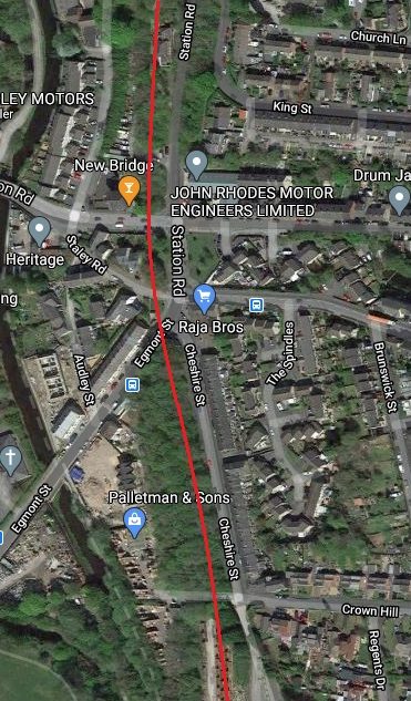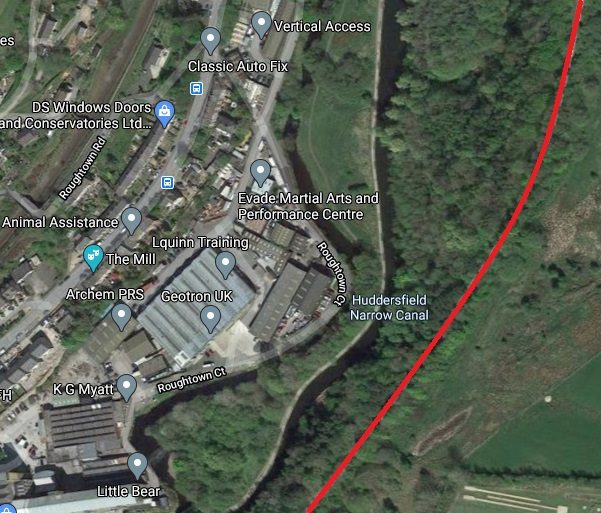 The same area as in the 25″ OS Map extract above. Stamford Mill has been replaced by Roughtown Court. The track-be of the Loop is marked with the read line. (Google Maps.)