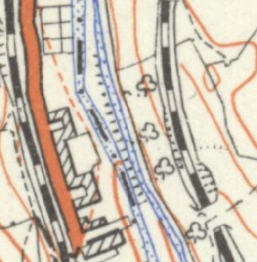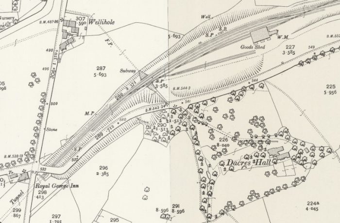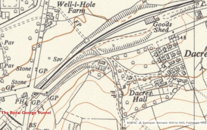 A further extract from the OS 1:10,560 series maps of the 1950s. The Royal George Pub and Tunnel are in the bottom left of the extract. The Goods Shed which features towards the top right was Friezland Goods Shed. [17]