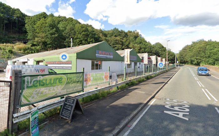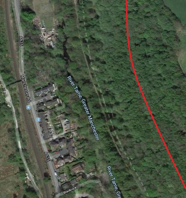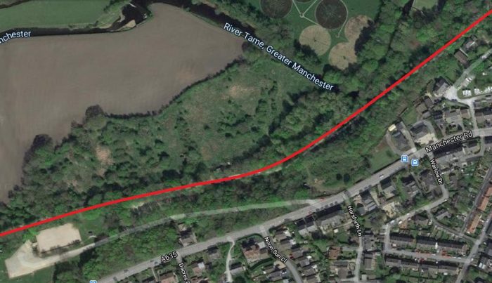Chew Valley Road at the point where the Micklehurst Loop crossed the road by means of an arched bridge. The trees sit where the bridge abutments once sat! (Google Streetview.)