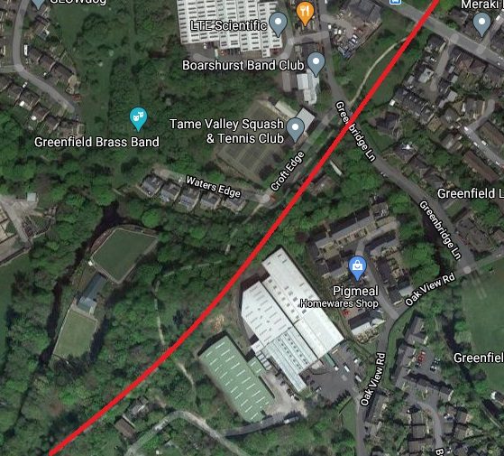 A 21st century view South the location of Micklehurst Passenger Station, taking in the location of the Micklehurst Viaduct. The old line is shown approximately by the red line. We are standing next to the pavement on Station Road and Cheshire Street can be seen in the far distance. (My photograph, 22nd January 2021.)