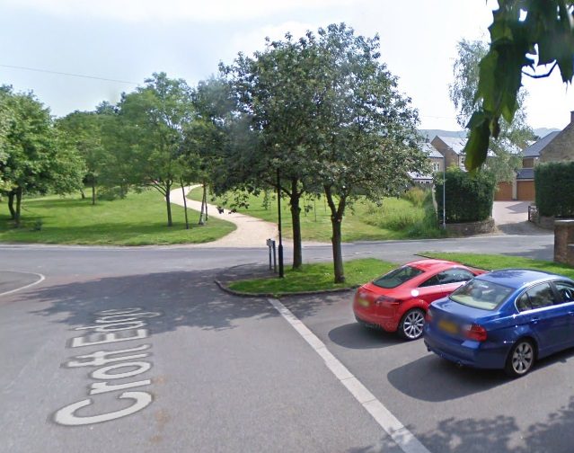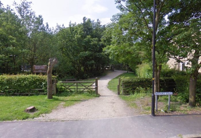 The public footpath dropped off the embankment of the old railway and followed the valley floor, meeting Waters Edge and Croft Edge before crossing Greenbridge Lane (Google Streetview.)