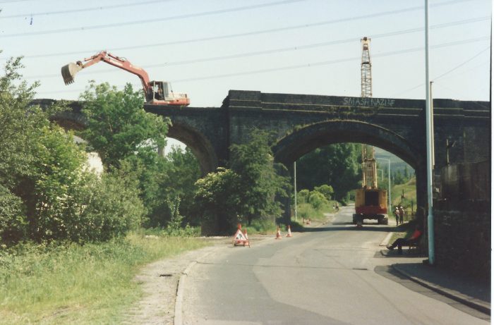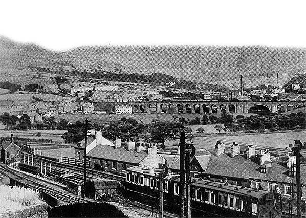 Dacres (or Friezland) viaduct on the Micklehurst Loop line, demolished at the end of 1970. The footbridge in the distance is at Friezland station. Although the station closed in 1917 the building (obscured by the telegraph pole) still stands in 2020, (c) Manchester Libraries.[35]