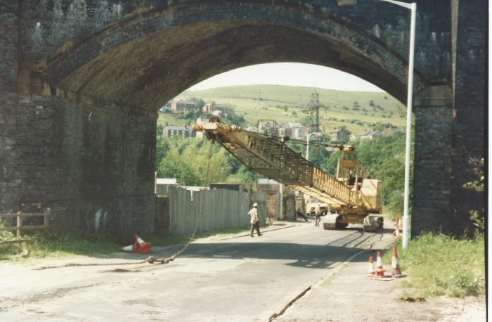 A view from the East on the A635. Man marking Ordnance Survey minor control revision point with an arrow on the corner of the parapet of the bridge which took the A635 over the Micklehurst Loop. In this image the road bridge can be seen crossing the railway just in front of the higher tunnel portal parapet. The Royal George Inn is in the background, (c) Manchester Libraries. [24]