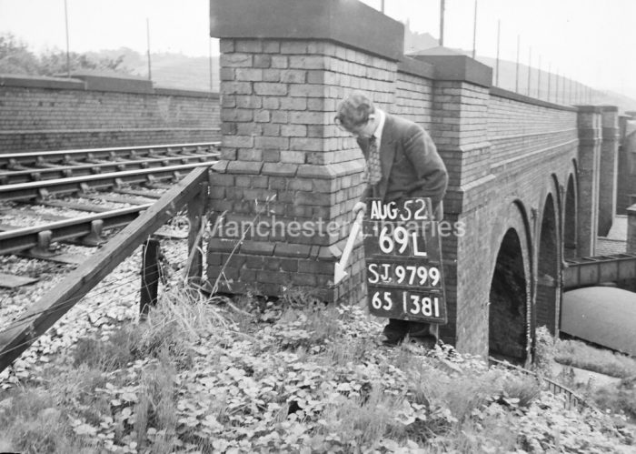 Man marking Ordnance Survey minor control revision point on the parapet corner of the first bridge North of Micklehurst Station – Winterford Road Bridge. Winterford Lane Bridge can be seen beyond, (c) Manchester Libraries. [24]