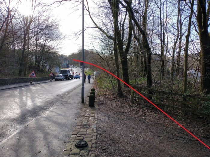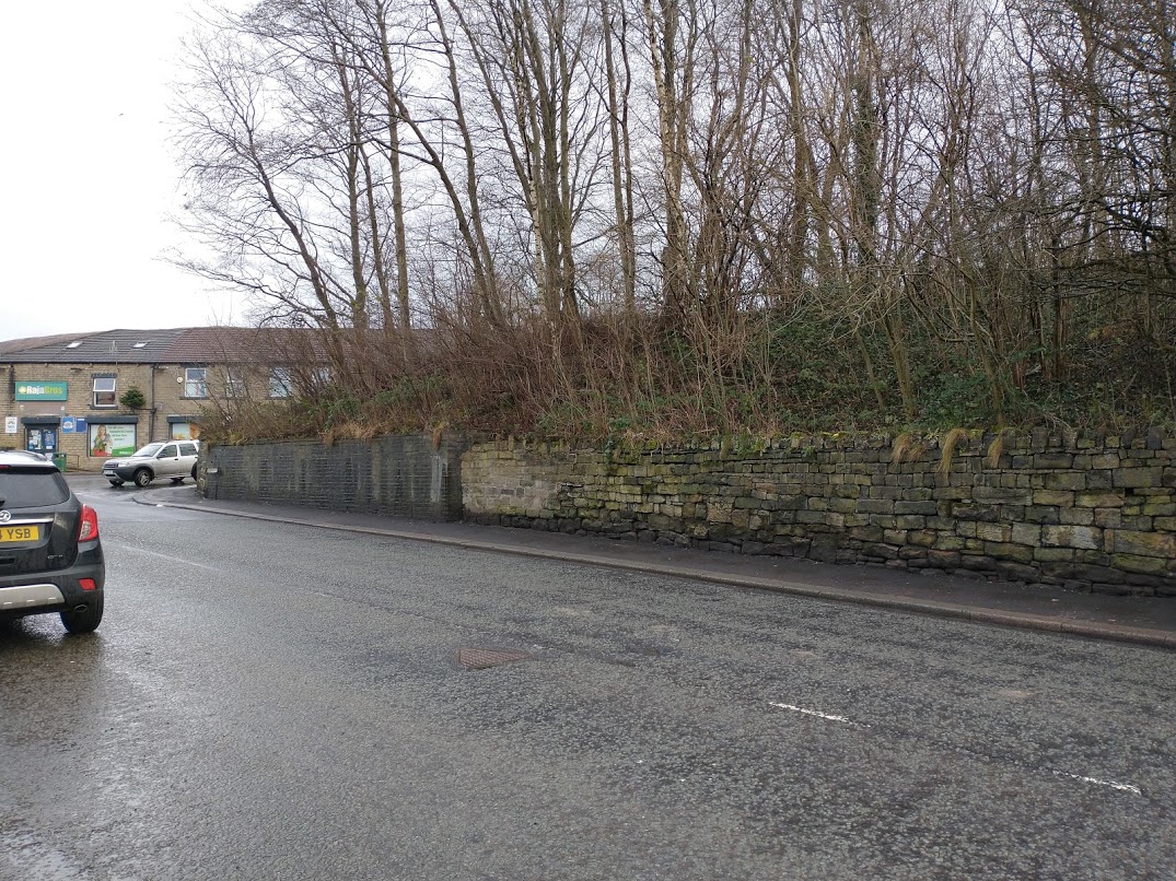 The footpath following the old line crossed Greenbridge Lane at road level and then continued along the path visible ahead which probably is below what was the platforms of Friezland Station. (Google Streetview.)