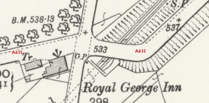 The Royal George Tunnel was named for the pub which stood over it at the junction between Manchester Road (A635) and Huddersfield Road/Well-i-Hole Road (B6175). The tunnel was 140 yards (128 metres) long. Immediately at its Northeastern end, the A635 was carried over the Line on a simply supported span.