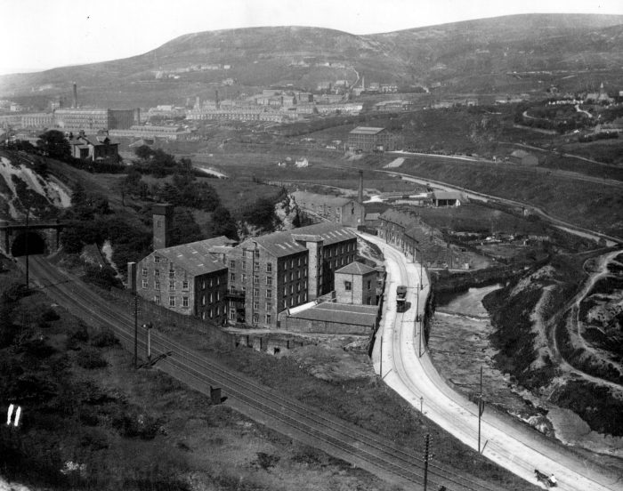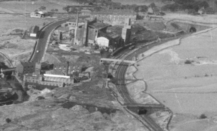 The layout of the mills as seen in 1947 from the air to the South. Winterford Road Bridge is on the right of the image. [2]