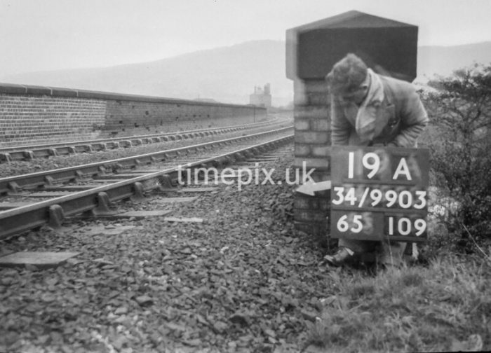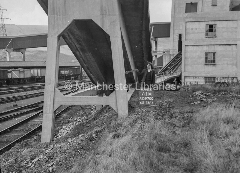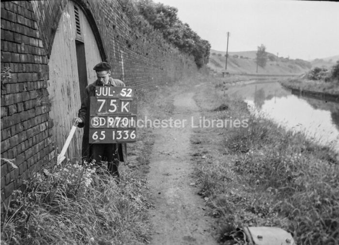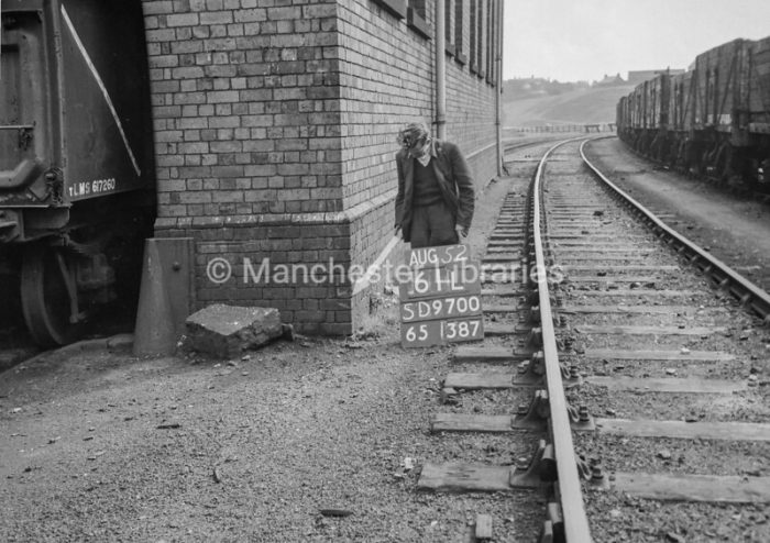 Man marking Ordnance Survey minor control revision point close to Friezland Goods Shed. The picture is taken looking to the West from a point directly opposite the Goods Shed along the North side of the MIcklehurst Loop. The signal box is visible in the middle-distance, (c) Manchester Libraries. [30]