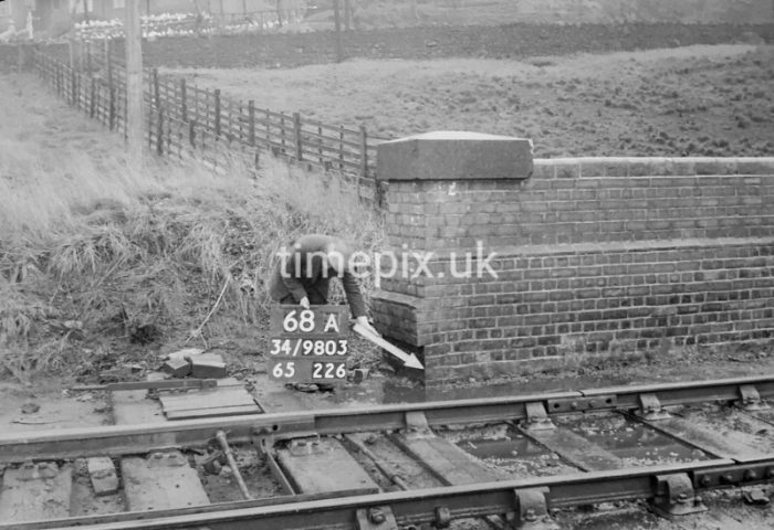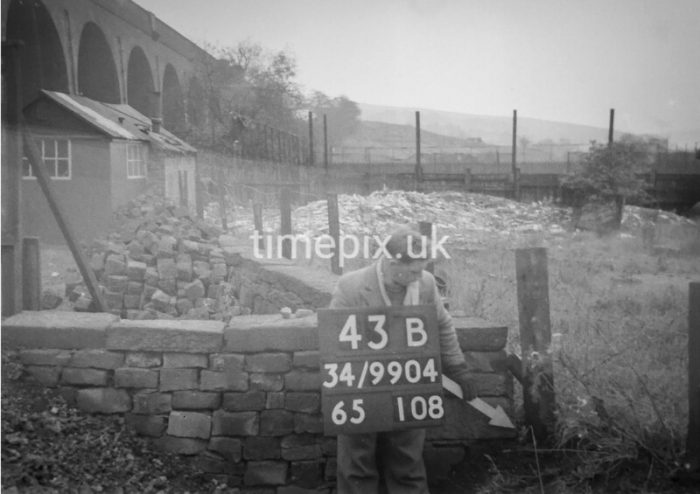 Man marking Ordnance Survey minor control revision point with an arrow on Friezland Viaduct. This picture is taken close to the Northeast pilaster at the end of the viaduct parapet and shows the location of Friezland Station in the 1950s. The station house still stands, as does the footbridge but it appears that the platforms have been removed, (c) Manchester Libraries. [37]