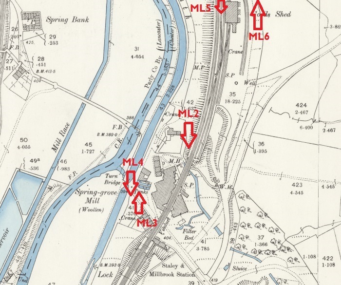 The next map extract shows the two railway lines with Roaches Bridge in the bottom left quadrant and two further mills: