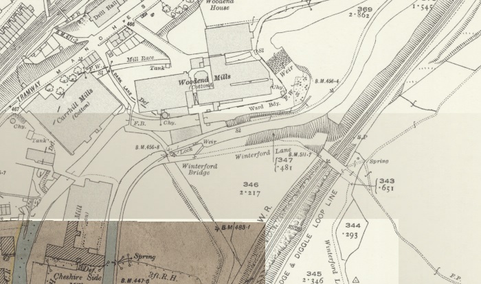 If you plan to walk the route, it is worth knowing that there is an Allotment Café beyond the Mills which are encountered if you walk down Winterford Road towards the River Tame and the Huddersfield Narrow Canal. The Mills are shown on the next OS Map extract below. By the turn of the 20th century, Cheshire Side Mill was disused but Carrhill and Woodend Mills were active.