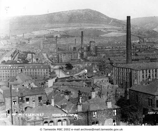 Mossley Gas Works – were first established in 1829 at Micklehurst, they belonged to the Stalybridge Gas Co. Ltd. In 1884, an agreement was made between Stalybridge Corporation and The Local Board of Mossley for the purchase of the Stalybridge Gas Co. and in 1885 the undertaking was divided between the two authorities and run jointly. [18]