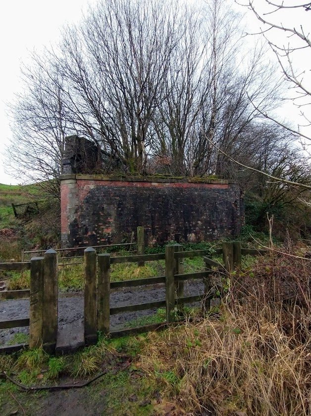 The line then began another gentle curve towards the Northeast. and passed under a series of three structures. First an arch bridge of similar construction to the first bridge out of Micklehurst Station. Then a footbridge spanning the two track mainline and then a longer footbridge which spanned the running lines and the Gas Works sidings.