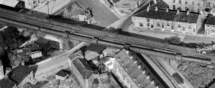 Man marking Ordnance Survey minor control revision point with an arrow on the bridge parapet of the bluebrick bridge across the line which appears in the aerial image above. The Gas Works can be seen in the distance beyond the fragile looking footbridge in the nearer distance, (c) Manchster Libraries.[23]