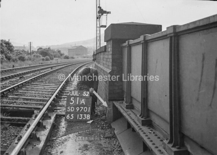 Man marking Ordnance Survey minor control revision point with an arrow on the Southeast pilaster of Friezland Viaduct. The photograph is taken looking along the Loop Line to the West, (c) Manchester Libraries. [38]