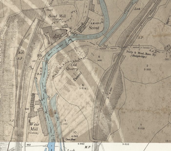 Milton Mill – was actually built in 1892 but did not feature on the 1898 OS 25″ Map but was included on the following series as the small extract above shows. The Architects were A H Stott & Sons and the mill was built for the Milton Spinning Co. Ltd. [11][5: p118]