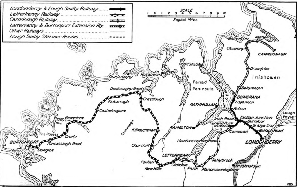 One day, I will get round to covering the route of the Londonderry and Lough Swilly Railway (L&LSR) which ran from Derry to Burtonport through some of the wildest of Co. Donegal scenery.