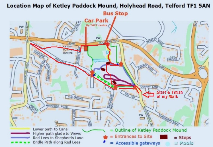 The route I took was to walk East along Holyhead Road to the bus stop adjacent to one entrance to Ketley Paddock Mound. The bus stop is a delight! It was painted in 2018 by Fran O’Boyle and funded by the Ketley Parish Council and the Friends of Ketley Paddock Mound. [10][11]