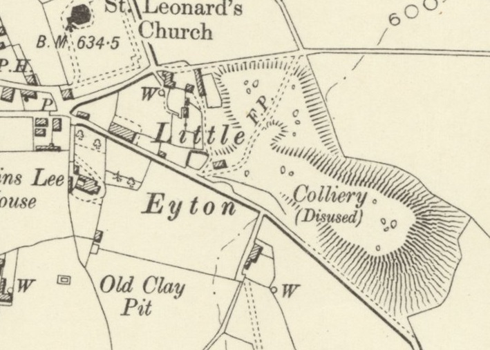 Little Eyton Colliery was already disused by the time the survey was undertaken in 1881/1882 for the 6″ OS Maps published in 1888. The tramway had not yet been lifted, so it appears on the map extract below.