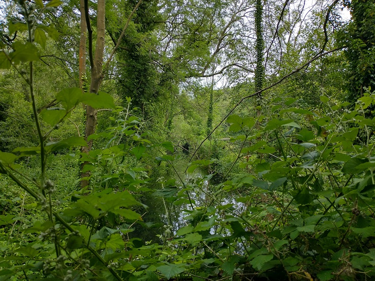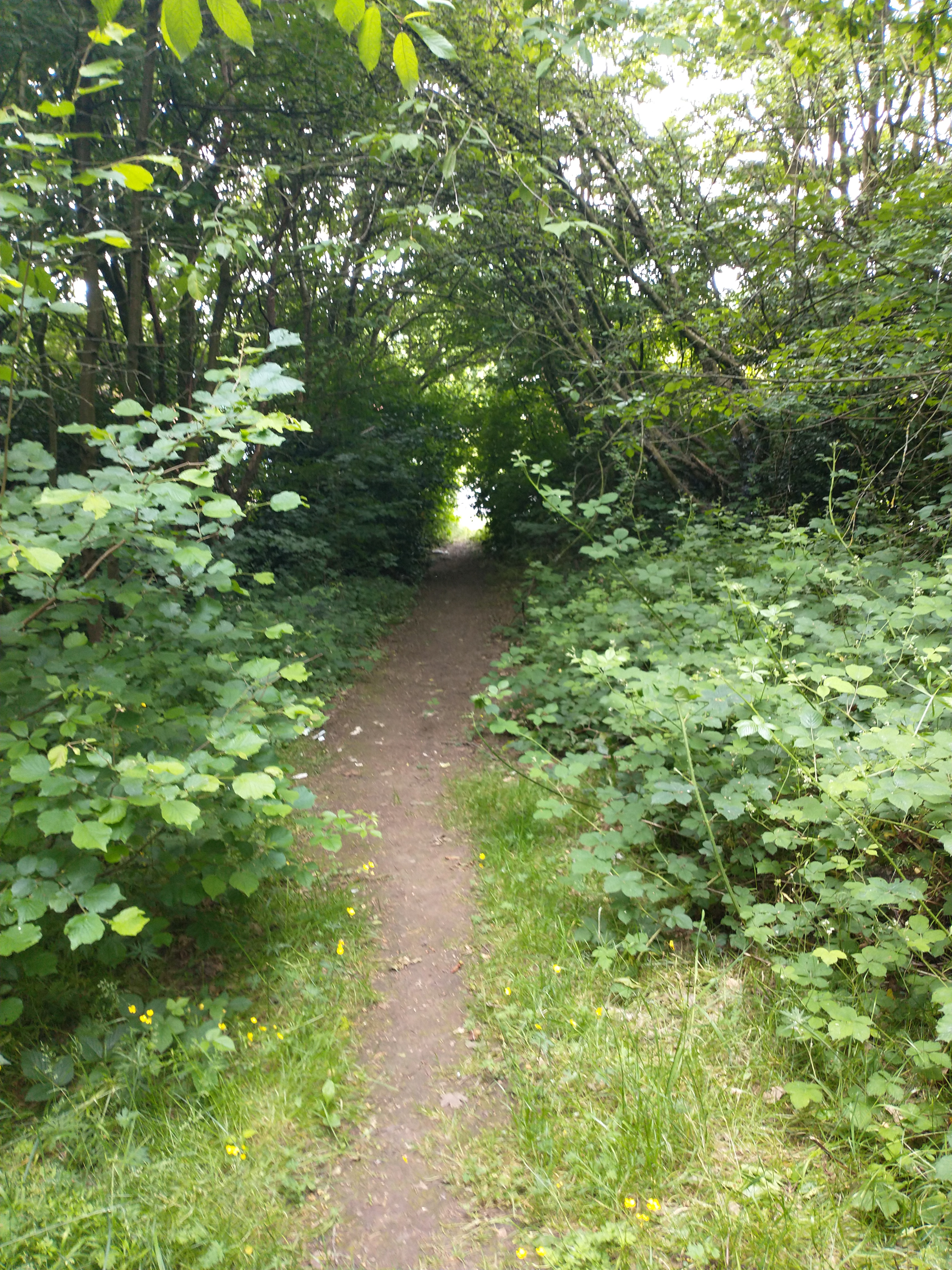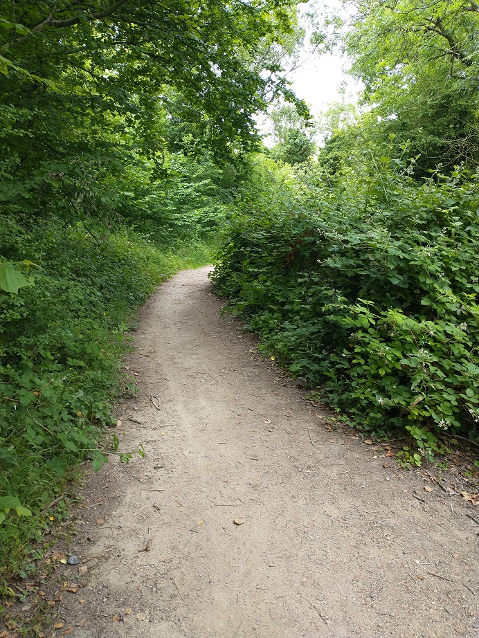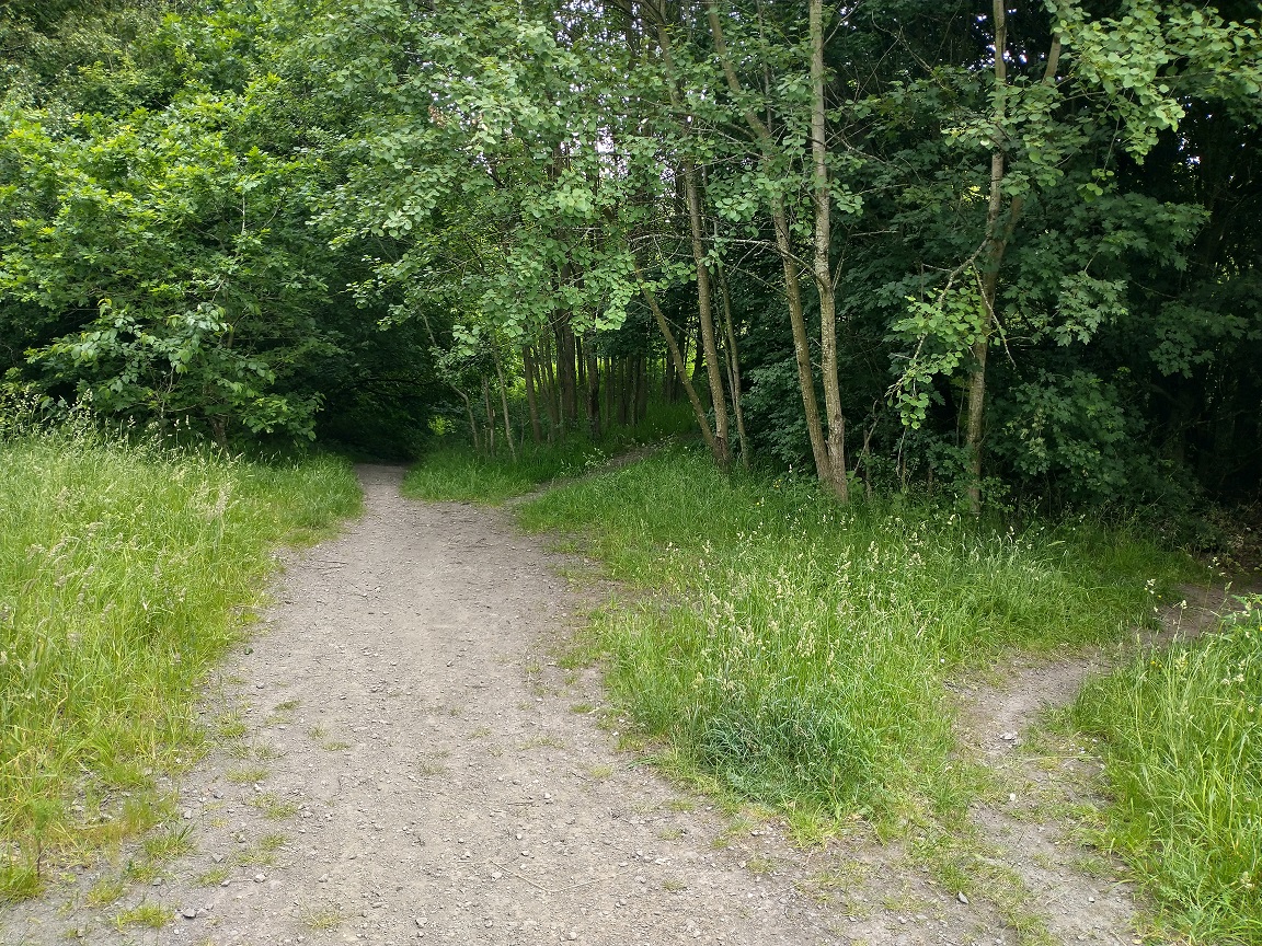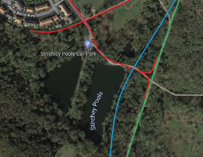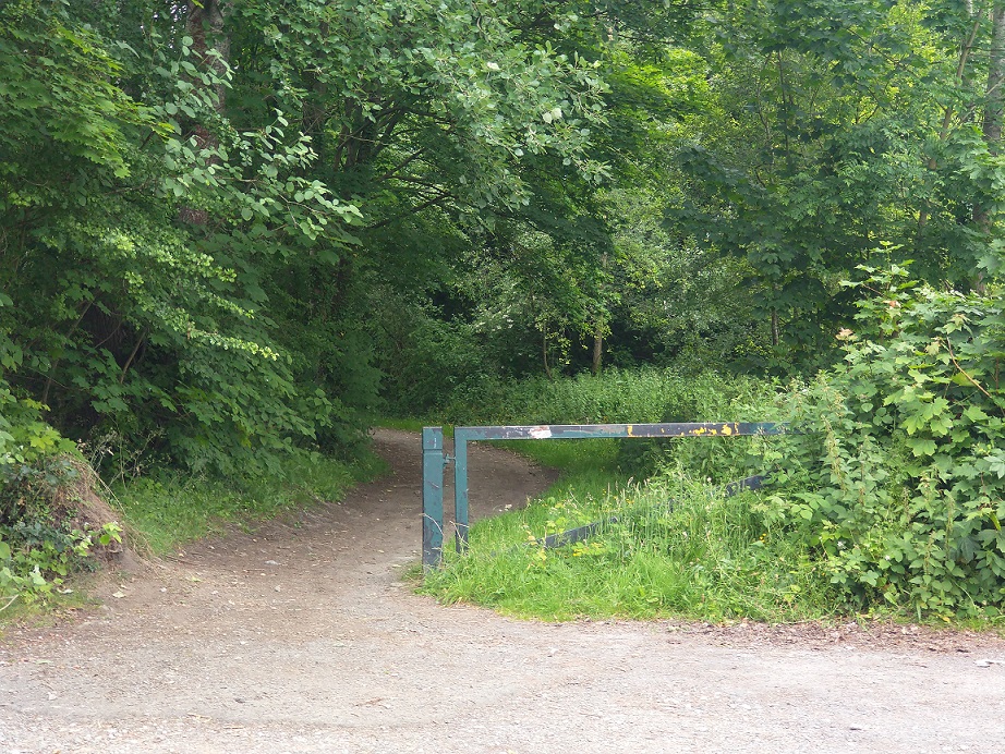 The old tramway route from Hinkshay Road runs along the metalled access to the modern car park at Hinkshay Pools. This view looks along the route from a point just South of Hinkshay Road. [My photograph, 15th June 2022]Close to the modern carpark we reach the point of another tramway junction. [My photograph, 15th June 2022]This extract from the 6″ OS Map surveyed in the early 1880s Shows the tramway crossing. The Ironworks that we have just encountered above (Jerry Furnaces) appear on the left of this image. South of those Works a tramroad runs Southeast past Hinkshay Pools which are given a blue wash on the map. In the bottom right of the extract, the line of the Coalport Branch of the Shropshire Canal is just visible. Our tramway route crossed the Canal on a bridge. The tramway running from the Ironworks on the left of the extract and crossing our route is a tramway which served Stirchley Ironworks. We will come back to this tramway in another article. [6]Looking West towards the location of the Ironworks. [My photograph, 15th June 2022]Looking East along the line of the tramway towards Stirchley Ironworks. [My photograph, 15th June 2022]This satellite image from early 2022 shows the approximate alignment of tramways in the vicinity of Hinkshay Pools as they are known locally (despite Google Maps calling them Stirchley Pools). Worthy of note is the green line which represents the standard-gauge Coalport Branch of what was the LNWR. The wharves alongside that railway were the terminus of the tramway that we have been following. Wharves were provided at a level above the Coalport Branch to allow easy loading of materials. The blue line shows the alignment of the Coalport Branch of the Shropshire Canal. The canal, at this location, can still be picked out as an elongated pool running close to the Hinkshay Pools. Also of interest is the name given to the estate road in the top left of this image. As we have already noted, the tramways in this vicinity were know as ‘Jerry rails’. [Google Maps]