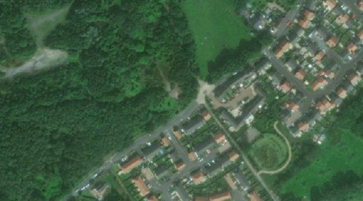 Little Eyton Colliery site at the turn of the 20th century. No tramway infrastructure remains at the site. The colliery slag heap remains and will continue to be a feature of the local landscape into the 21st century. [2]The same area in the 21st century as it appears on the ESRI World Image, Background map as provided by the National Library of Scotland. The large green sward of land surrounded by mature trees is the old colliery site and slag heap. The land remains significantly higher than the immediate locality and has been ‘rewilded’ to provide s pleasant meadowland and wooded area. [2]